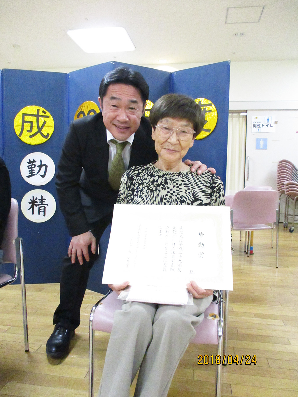 昨年度一年間で、週5日以上、ご利用されている方には感謝状、お休みが少なかった方には精勤賞、お休みがなかった方には皆勤賞、職員の感謝の気持ちをこめてお贈りいたしました。