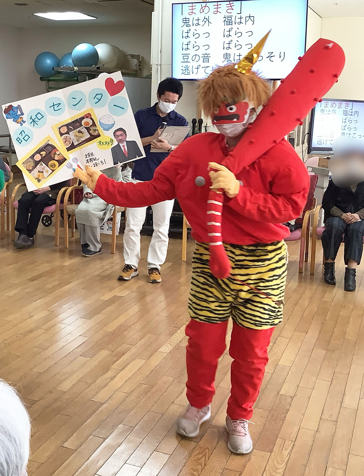 センターの美味しい食事を独り占めしようと鬼がやってきました。